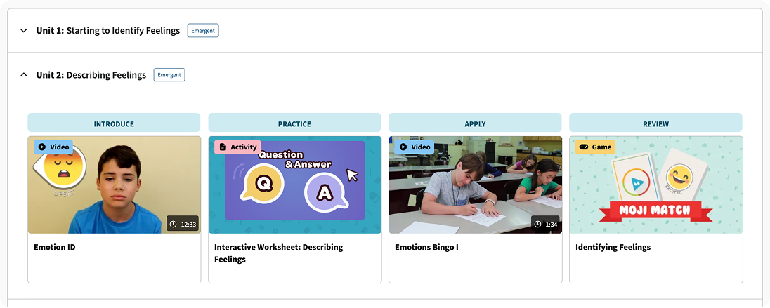 Units build on one another to support skill development over time. Students grow in confidence through repeated exposure and practice on skills like calming down, asking others to play, and advocating for themselves.