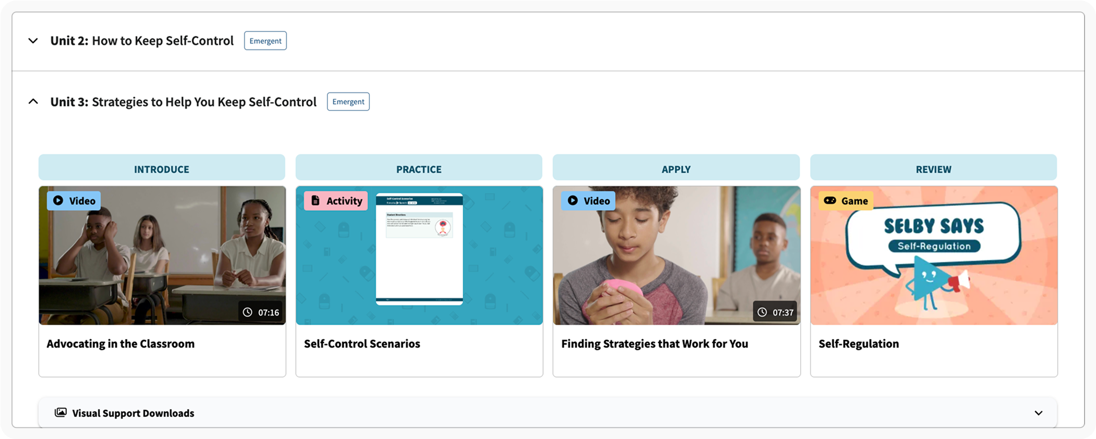 Each unit introduces a skill with a video lesson, then reinforces learning with interactive games and worksheets. Units build on one another to support skill development over time, from lower elementary through upper elementary and beyond. Students grow in confidence through repeated exposure, peer modeling, and practice on skills like calming down, asking others to play, and advocating for themselves.
