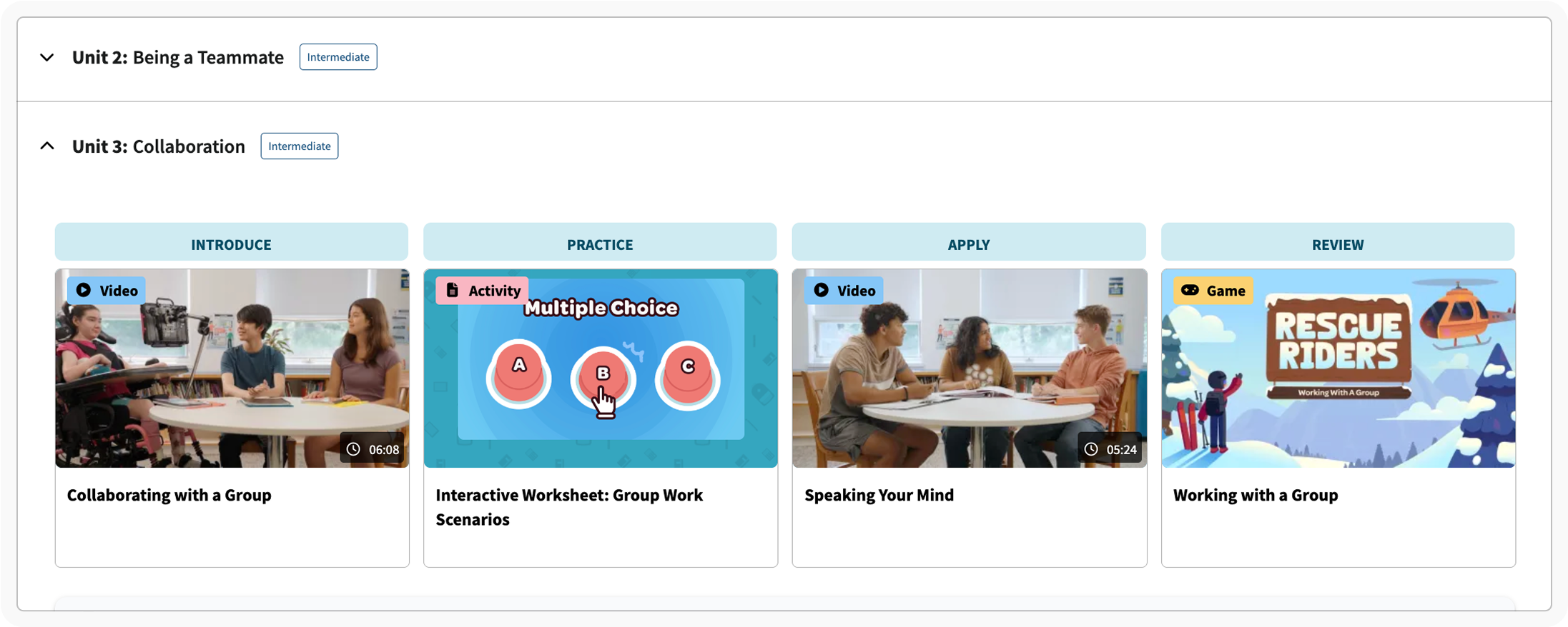 From navigating peer pressure and handling group projects, to resolving conflicts or preparing for job interviews, our video modeling lessons make abstract concepts concrete and relatable.